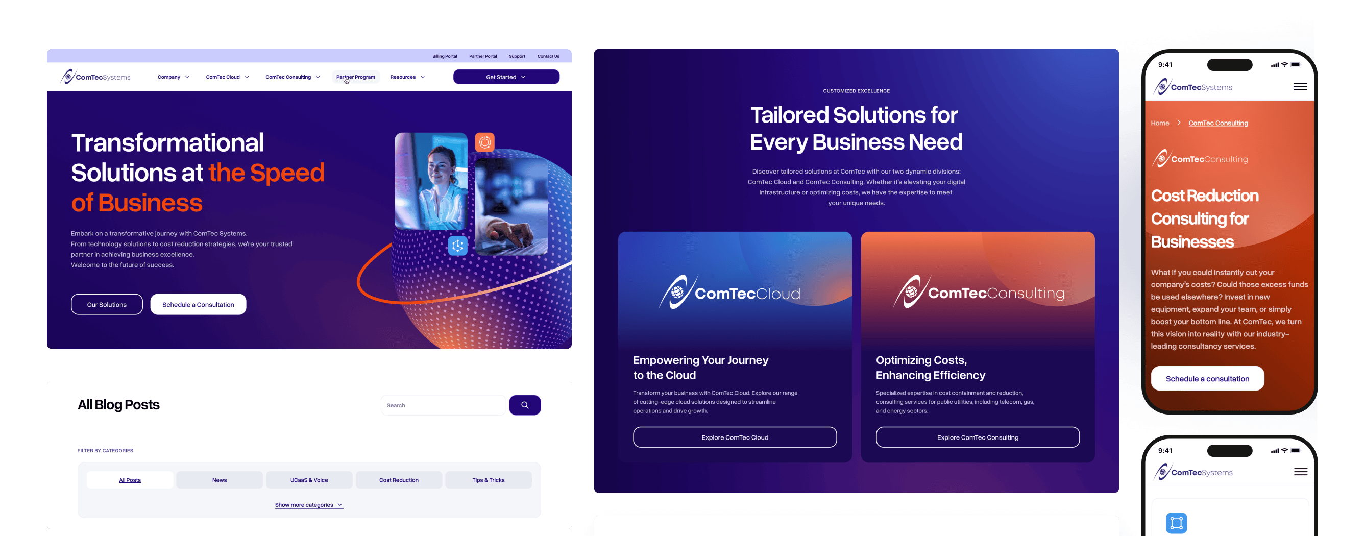 The result is a modern, user-centric website that captures ComTec’s vision of "Transformational Solutions at the Speed of Business." The new design improves lead generation and SEO through intuitive navigation and visual hierarchy. A cohesive brand system with gradients, iconography, and structured layouts reinforces professionalism and strengthens brand recognition across all channels.