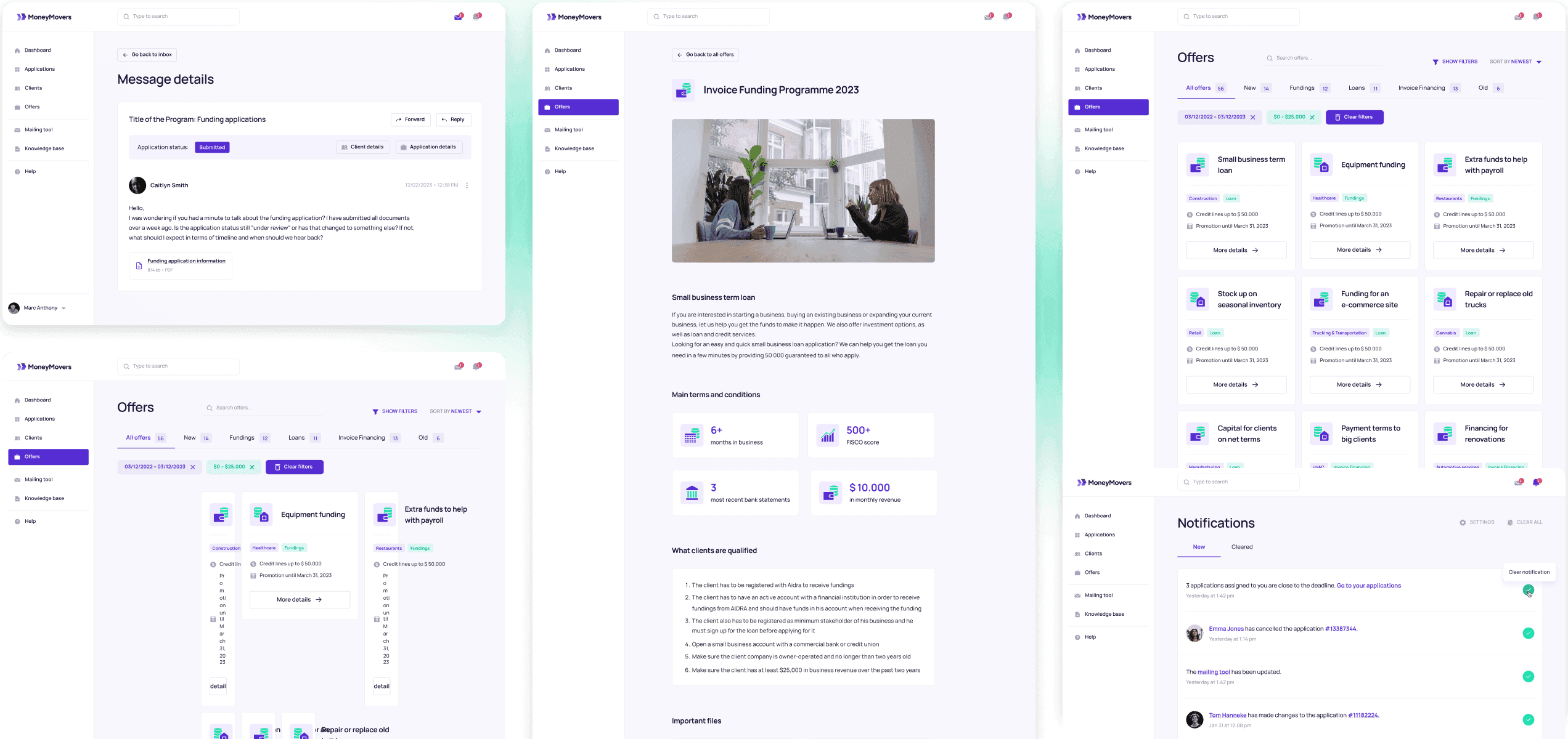 As part of our online application concept, we developed the Money Movers brand from the ground up. The brand identity features the modern Manrope font paired with a vibrant purple and green color palette.