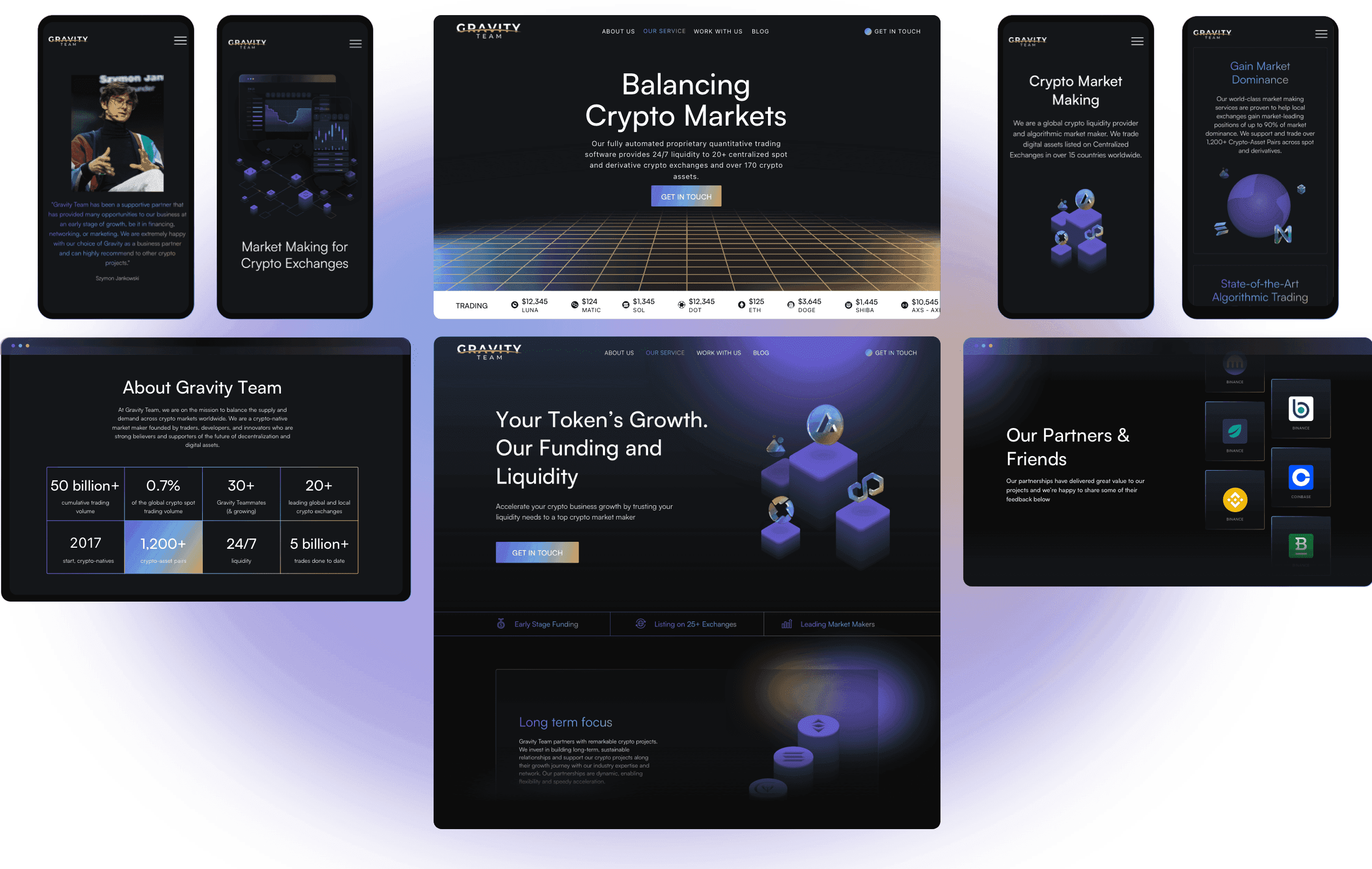 By integrating a visually captivating animation to emphasize liquidity for cryptocurrency exchanges and curating a section dedicated to partner testimonials, we aimed to illustrate the breadth and depth of Gravity Team's contributions to the industry.
