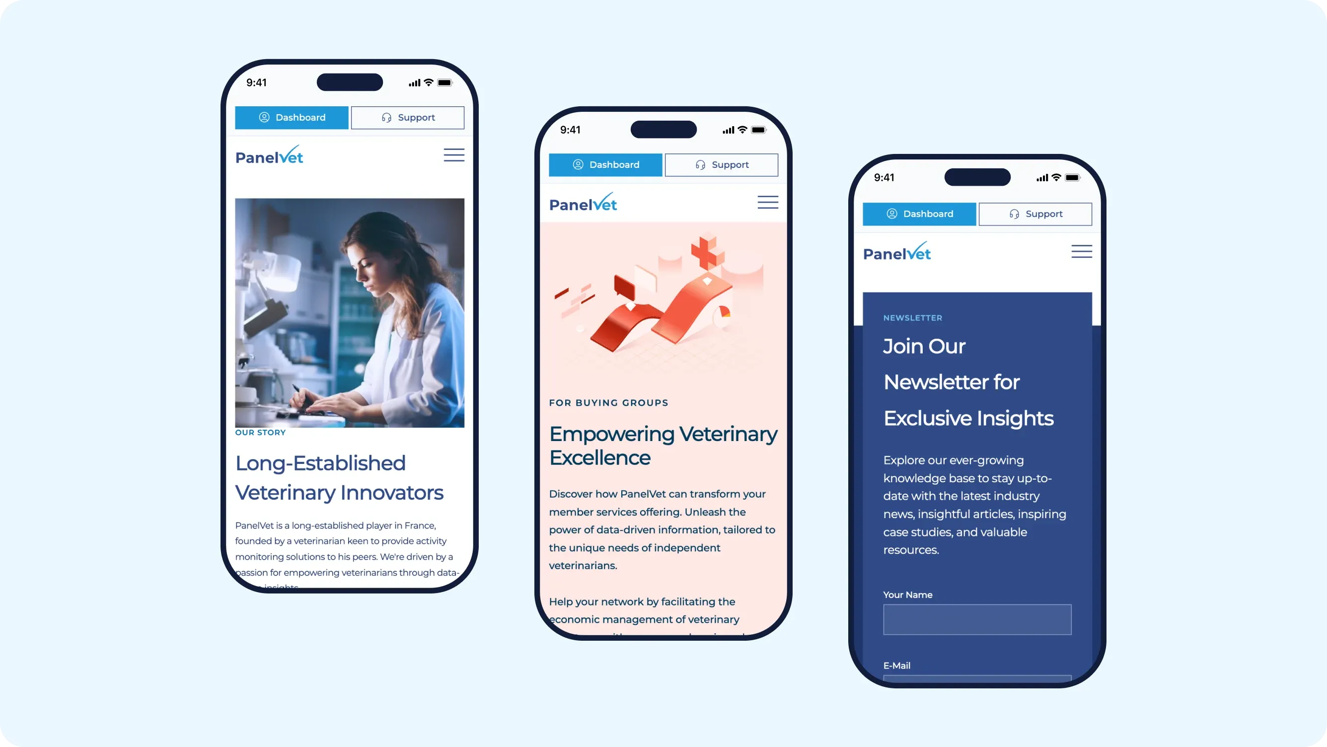 PanelVet needed to modernize its digital presence to effectively showcase its B2B diagnostic solutions for veterinary care. Their previous website did not convey the technical sophistication and reliability expected by veterinary professionals. The challenge was to create a platform that clearly presents their advanced diagnostic tools, lab result management, and data analytics while building trust within the industry.