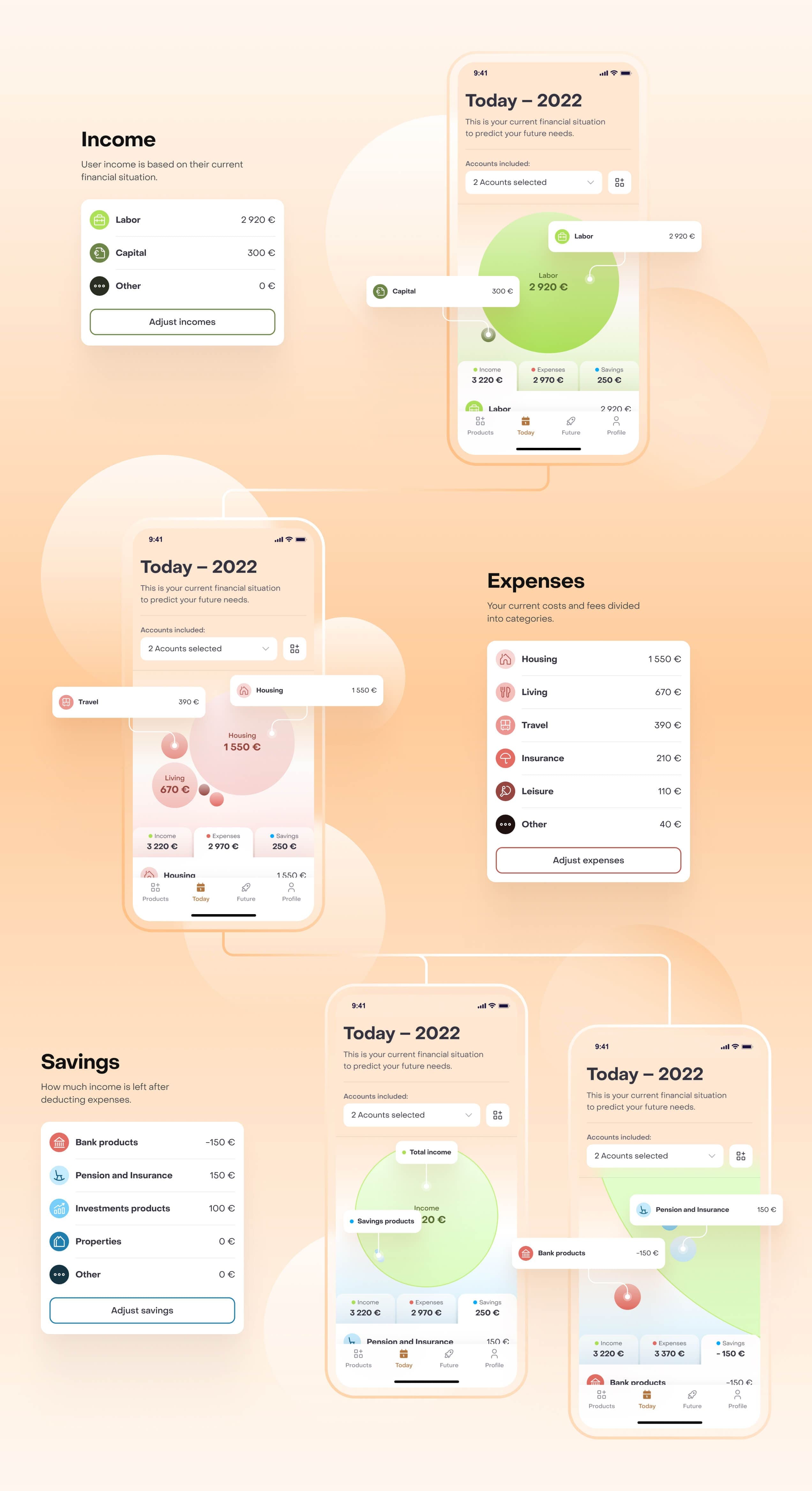 The Today dashboard in the application provides users with a snapshot of their present financial status. The use of color coding adds to the visual ease of understanding, with each bubble symbolizing a distinct financial product. This feature enables users to conveniently enhance their financial situation by making adjustments to their income, expenses, and savings.