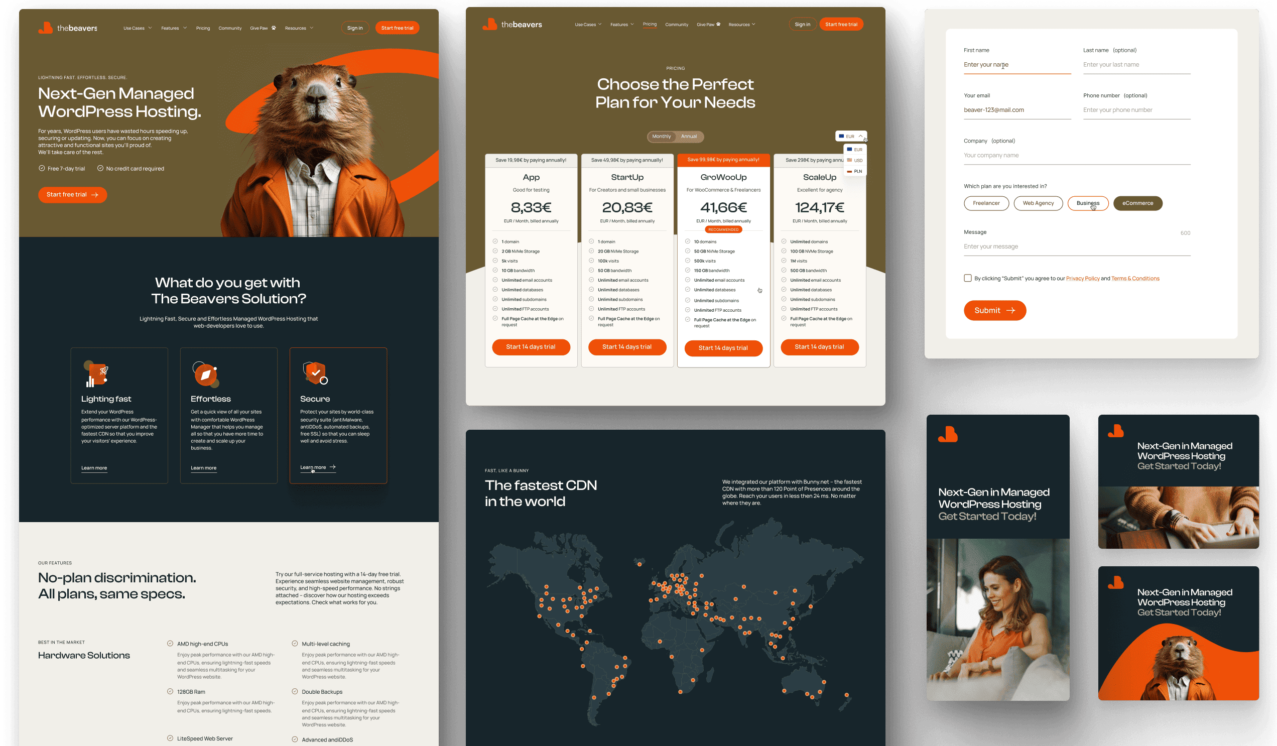 The Beavers, as a nascent brand entering the competitive hosting and website development space, faced the challenge of establishing a unique brand identity. With no pre-existing branding, they needed to craft a compelling visual identity that would resonate with their target audience and make them stand out from the crowd. Then, they had to use that brand identity to make their website design more memorable.
