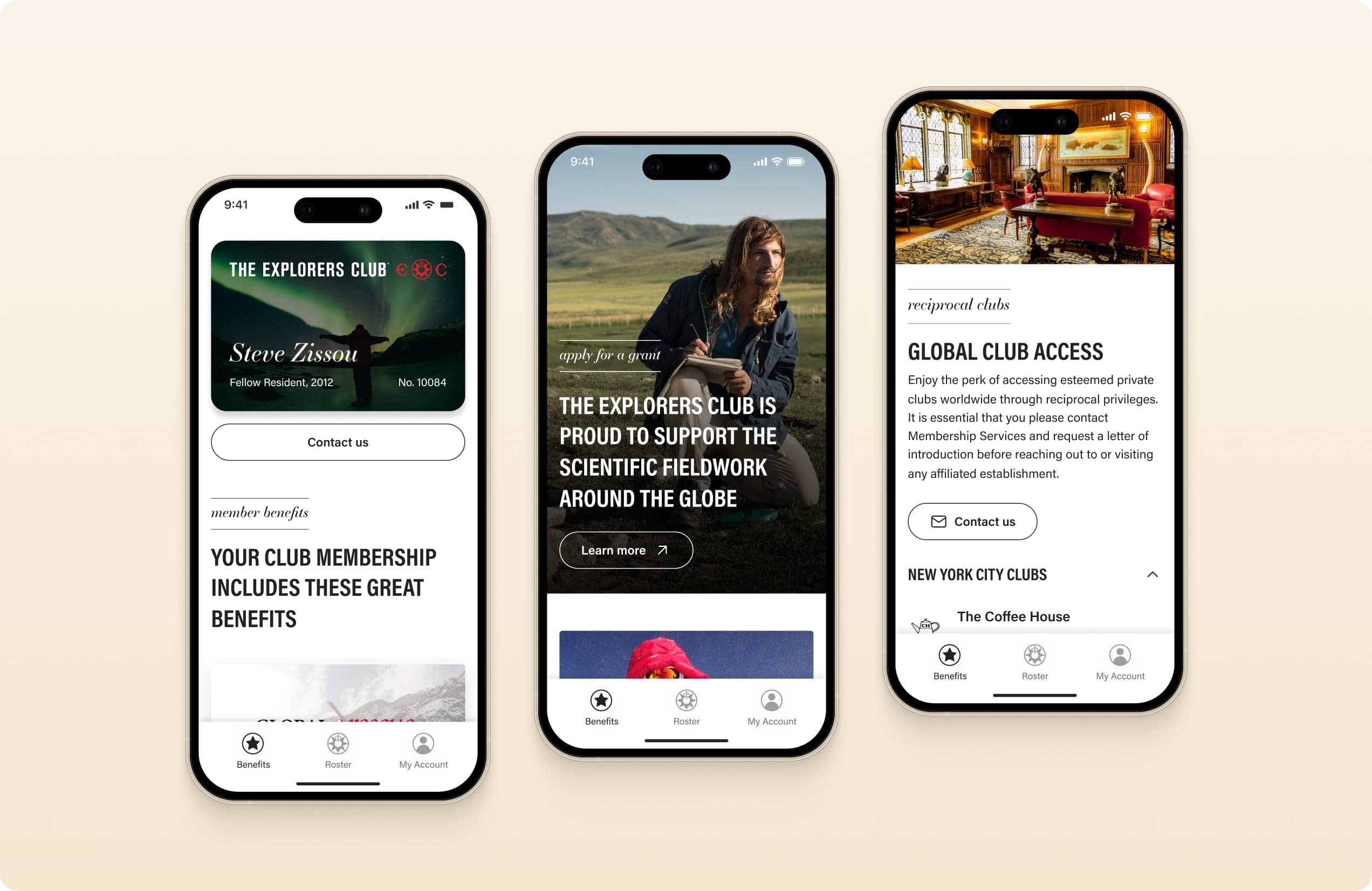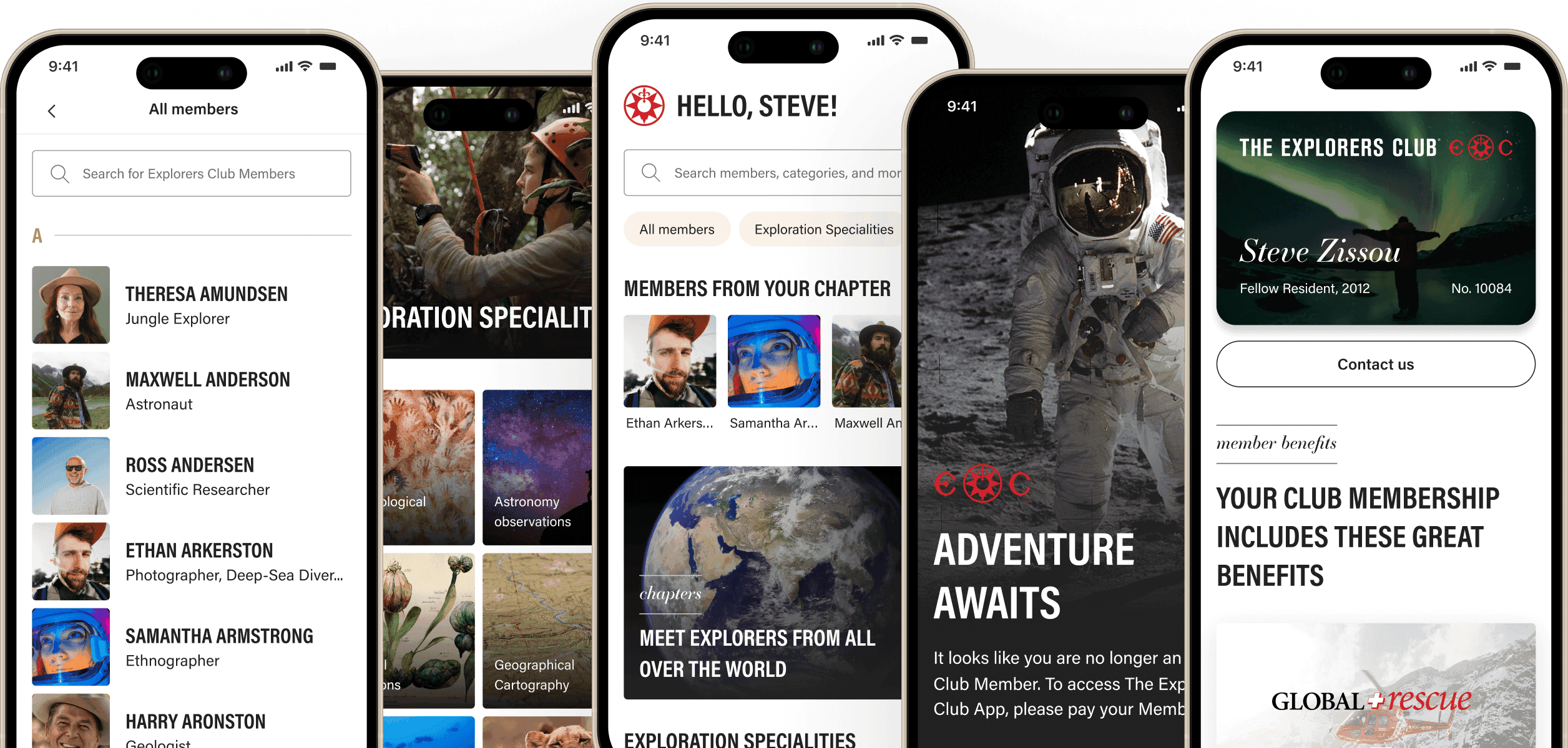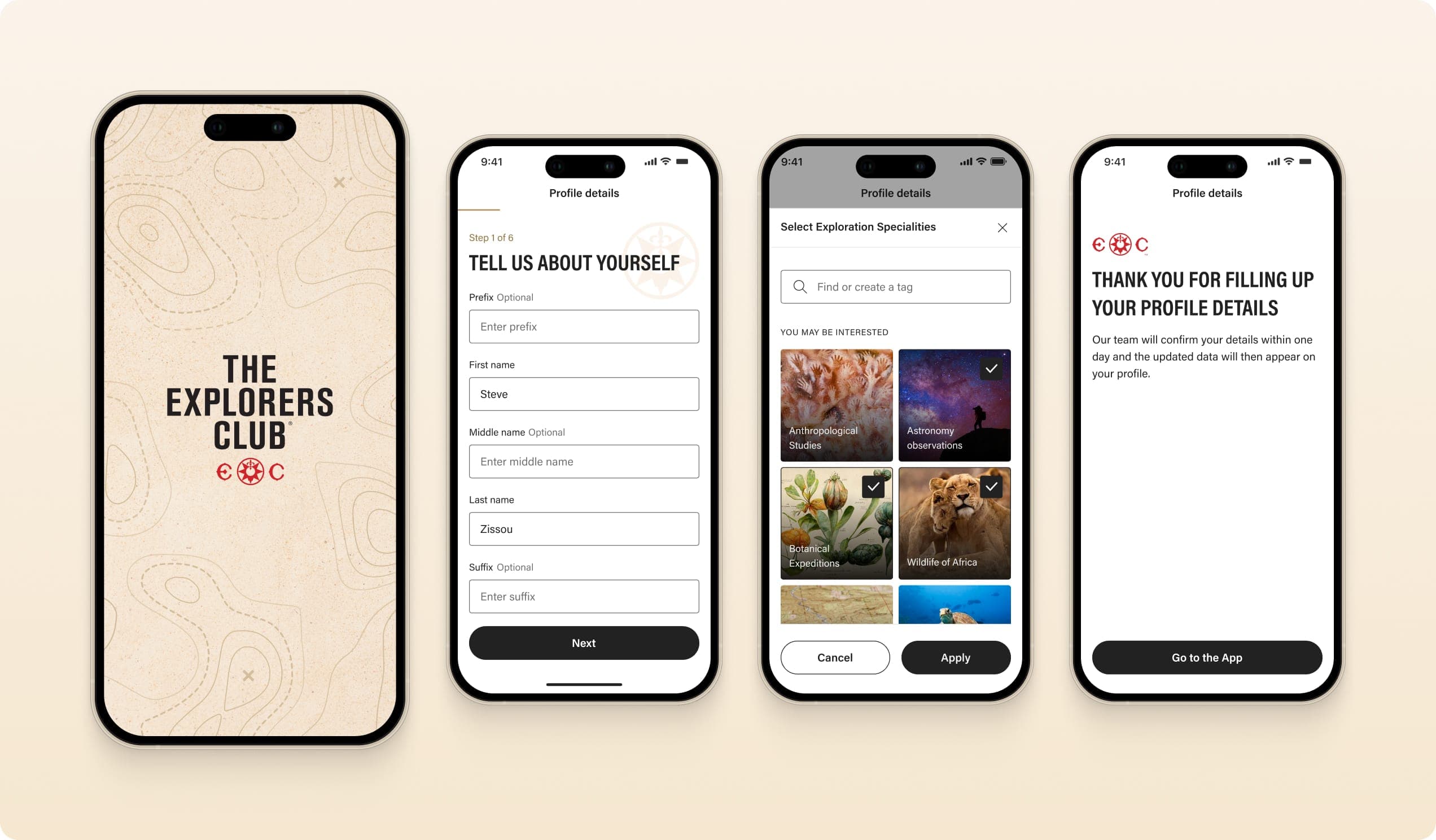 The branding reflected the prestige of The Explorers Club while keeping the app approachable. A clean design system unified typography, colors, and layouts, creating a modern yet timeless look.