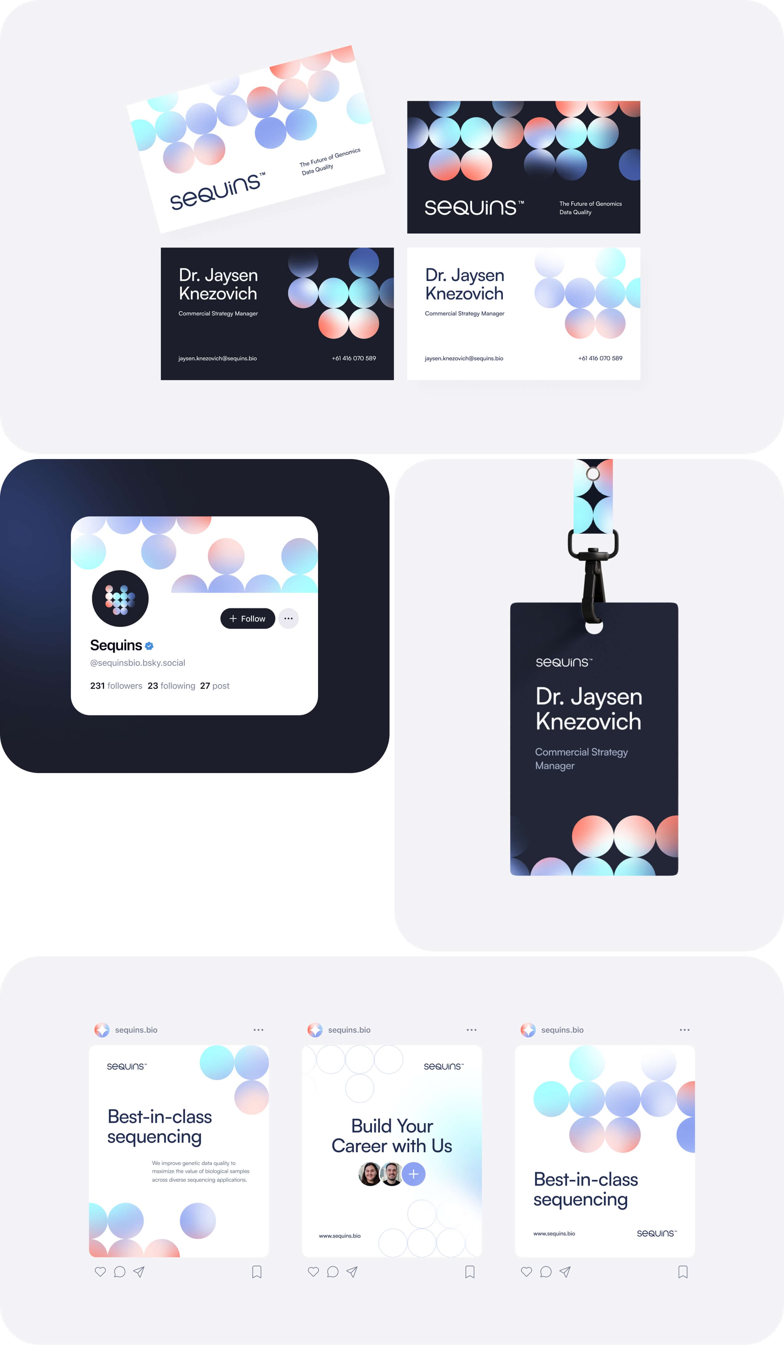 The branding centers on the idea of mirroring natural genomic sequences with synthetic precision. A minimalist aesthetic paired with dynamic visuals conveys innovation and trust, emphasizing Sequins’ commitment to accuracy and quality in biotechnology.
